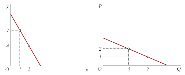 마지막으로 그래프 보는 법을 잠깐 소개합니다. 일반적으로 수학에서는 가로축(x)이 변하면 그결과를 세로축(y)에 표시합니다. 예를 들어 y=-3x+10의 일차함수에서 x가 1에서 2로 변하면 y 는 7에서 4로 변합니다. 하지만 경제학에서는 독립변수인 가격을 세로축에, 종속변수인 수요량을 가로축에 그립니다. 그래서 Q=-3P+10의 수요곡선에서 가격(P)이 1에서 2로 변하면 수요량(Q) 은 7에서 4로 변한다고 해석합니. 따라서 경제학에서는 가로축이 아닌 세로축을 기준으로 식을 정리하는 습관을 들여야 합니다. (사실 이게 좀 애매한 게, 또 어떤 식에서는 가로축을 기준으로 둘때도 있습니다. 차차 소개할테니, 일단 이러한 차이가 있다는 걸 알고 있어야 합니다)